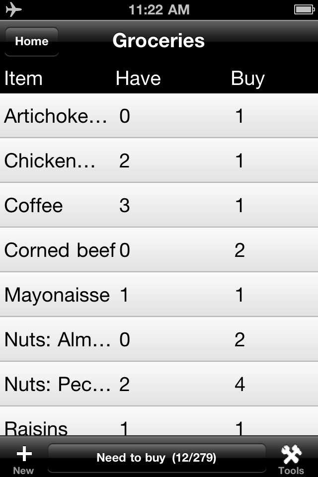 The screen shots are mostly self explanatory. The first one is the "default view," which is just a list of the items in our grocery database, with quantities on hand, quantity in each of several storage locations, target stock level, and a "Buy" quantity. The next screen is the "Need to Buy" view, which lists the only the items with a buy quantity of 1 or greater. That is the essence of our shopping list. We have 279 items in our grocery database, and 111 discrete storage locations; hence the need for an organized approach.